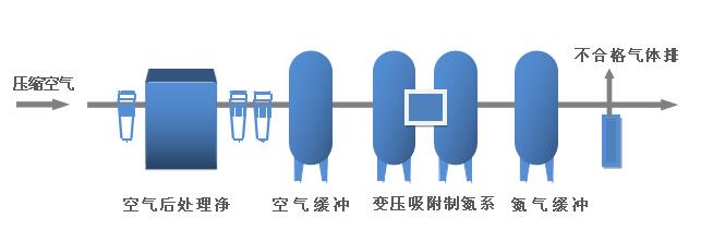 【三陽制氮設備主要組件:】空氣后處理凈化系統,空氣緩沖罐,變壓吸附主機系統及氮氣緩沖罐及控制系統組成。